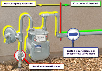 NOTE: When you hire a licensed contractor to install your valve, it is important that you ensure that the valve is installed on the downstream side (that is, the customer side of the meter). Earthquake valves are not permitted in utility curb meter vaults. Earthquake valves are not permitted in utility curb meter vaults.